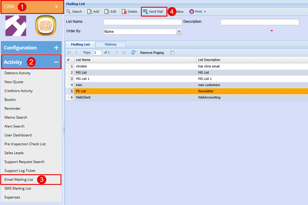 CRM > Activity > Email Mailing List