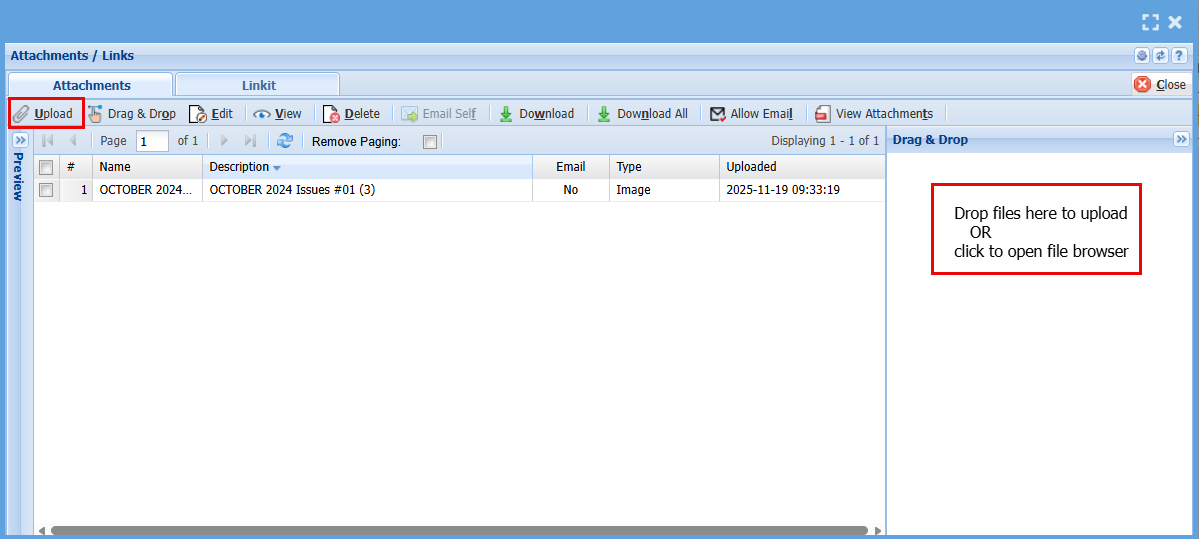 - Click "Upload" or drag and drop your attachment in the "Drag & Drop" box