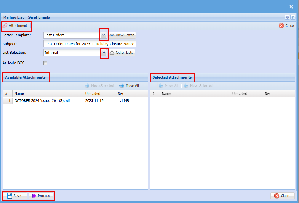 | Selected Attachments | These are the attachments that have already been selected to be sent out with the email. |