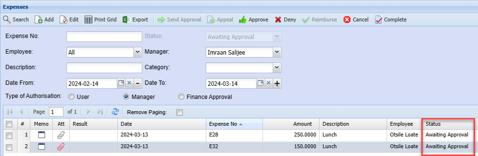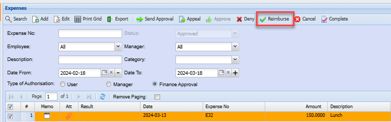 The finance manager will then Appeal, Deny or Reimburse the expense claim.