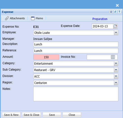 | Amount | Enter the expense amount |