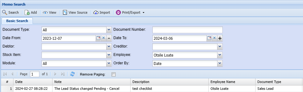 Employee: Search for all memos made by a specific employee/ All employeesModule:Search