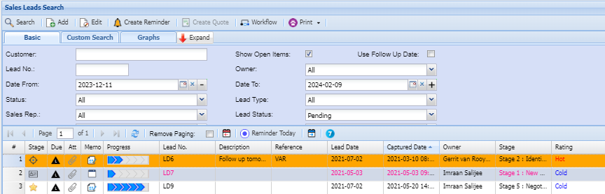 | Basic Search | You can search for a sales lead by making use of filters under the basic search tab |