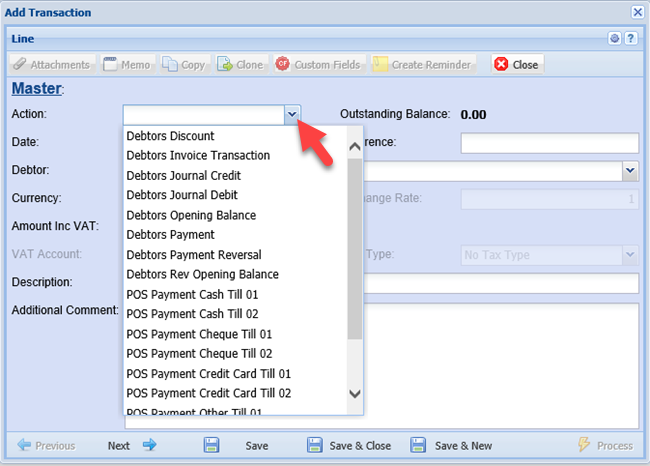 Select journal Action from the drop down list e.g debtor journal debit Enter the action of the journal transaction This governs how the transaction will update general ledger accounts |