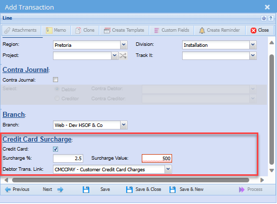 | Credit Card | Select if charging a credit card surcharge with the payment |