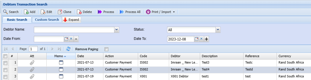 Debtors Module> Activity> Debtors Journal Transactions
