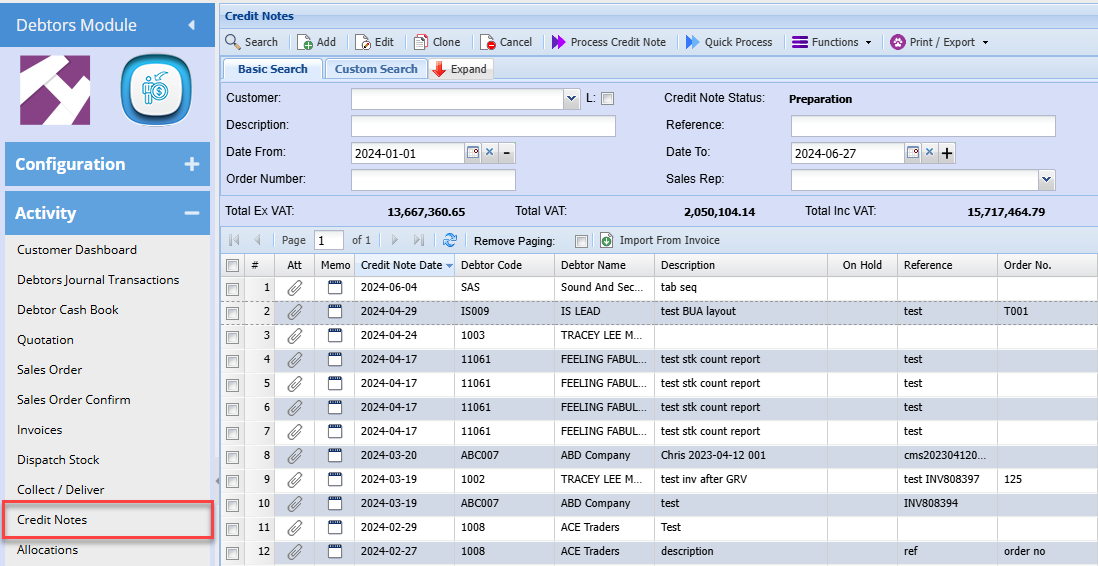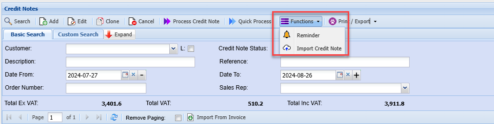 | Reminder | Allows you to create a reminder for a particular credit note |