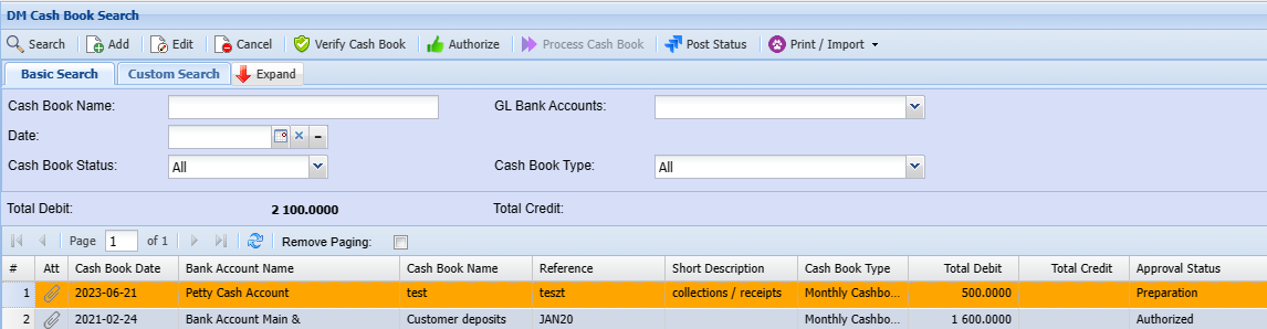 | Authorize | Authorize cashbook before processing this activates the process button |