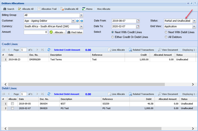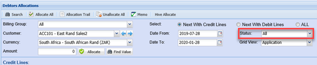 The status setting is set to Partial and unallocated; this means the allocations screen will only show transactions which have not be allocated or are partially allocated. If the transaction is fully allocated it will not show on this setting.