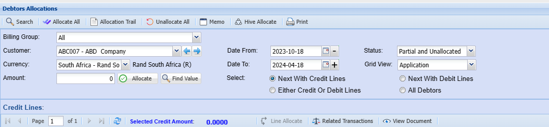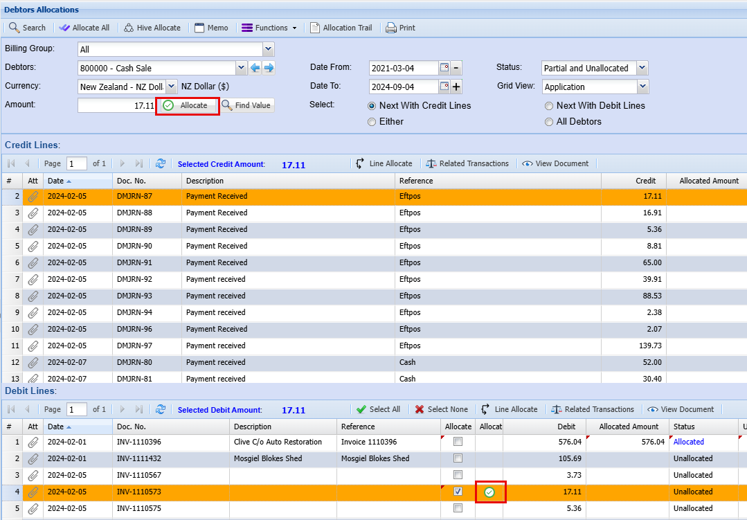 To Allocate a payment to an invoice highlight the Credit line or payment, or top grid and select a corresponding invoice, debit line on the bottom grid. Once highlighted, click on the allocated button either at the top or the green tick