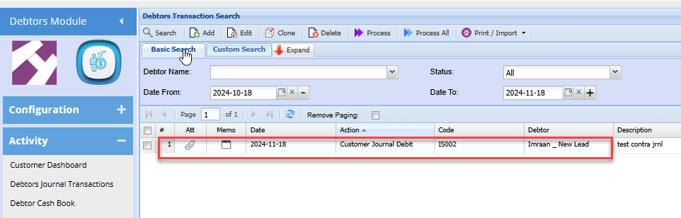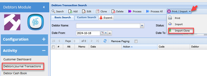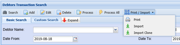 Debtors Module >Activity > Debtors Transactions > Print /Import