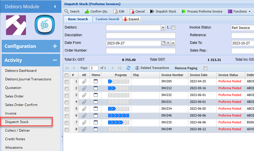Debtors Module> Activity> Dispatch Stock