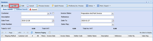 The Invoices screen will now appear. This screen displays all existing invoices that have not been processed and new invoices are also created here. To create a new invoice click on Add.
