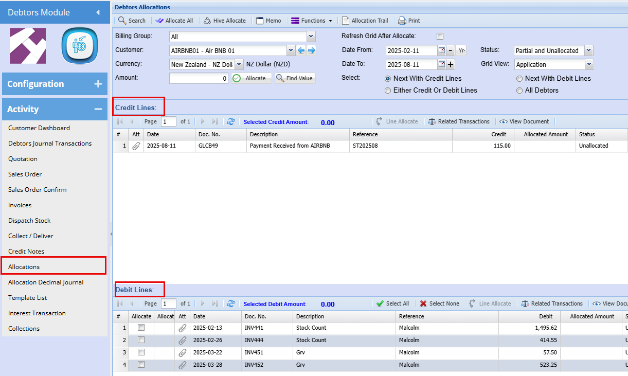 In this case, as shown below the $115 is in the Credit column and you’ll therefore need to process a Debit to AIR BMB 01 to reverse the misallocation.