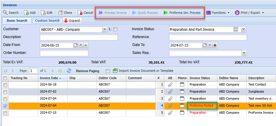 When you search the invoice on the grid, you will notice the status is preparation but it will indicate this is Proforma in red