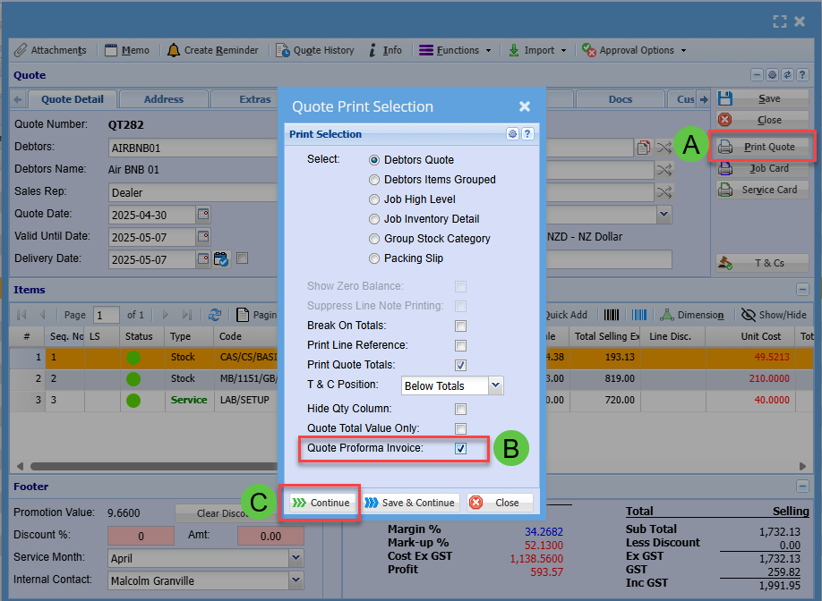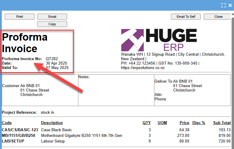 This will change the header of the quote and labels to read Proforma Invoice.