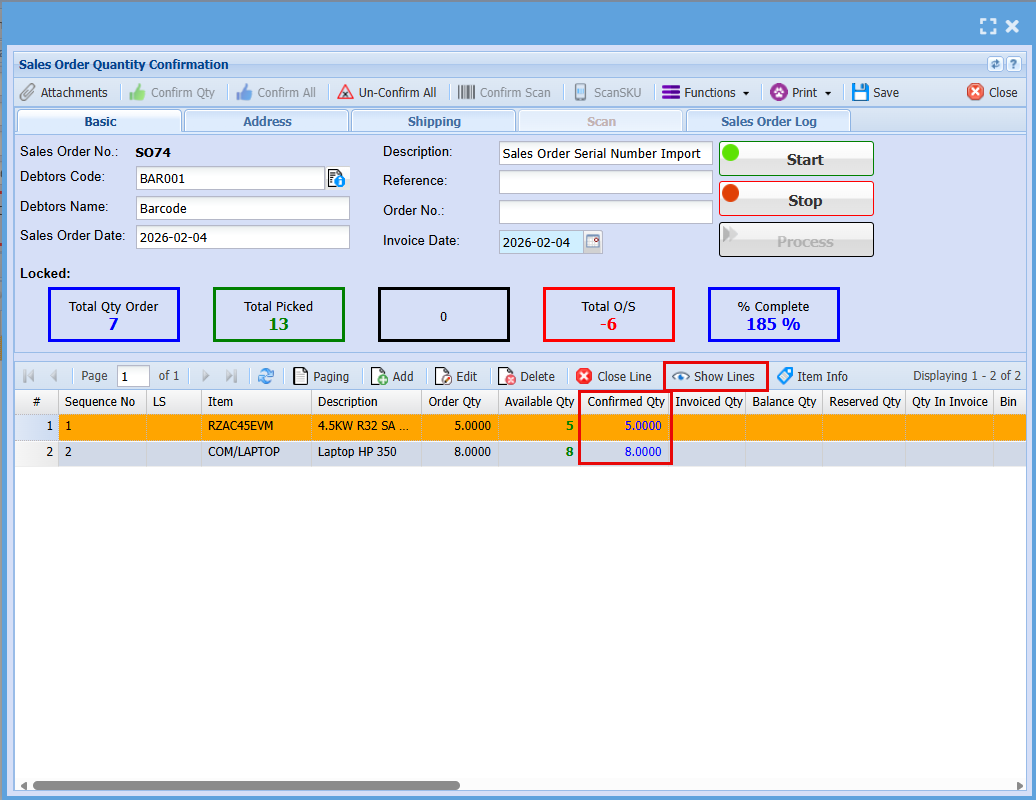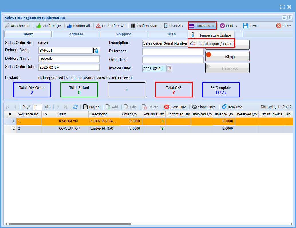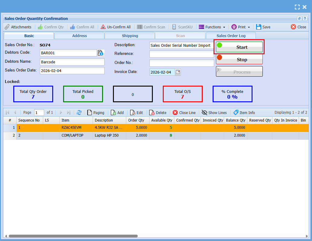 Click Start to begin your picking. You won’t be able to import serial numbers until you have clicked Start.