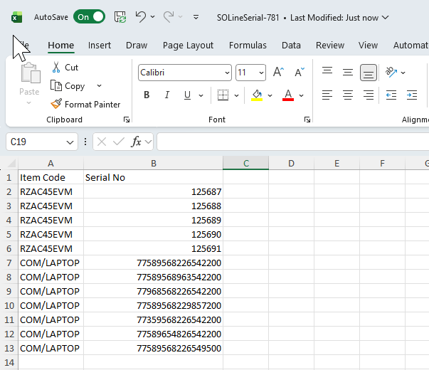 - Enter the serial numbers into the spreadsheet, with each item listed on a separate line as shown below.