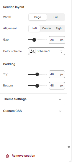 Applies a predefined theme color set (e.g., background, text, buttons) based on your store’s design system — “Scheme 1” is one of those presets.