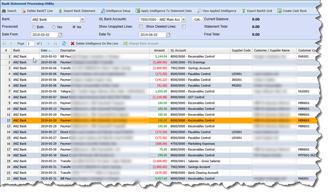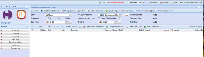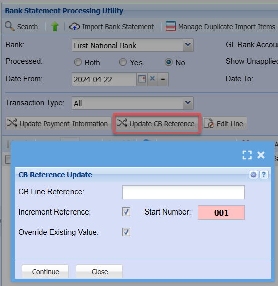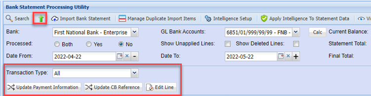 | 2 | Update CB Reference - Update Cashbook Reference on lines, Bulk update bank lines with the Cashbook reference. Future work will be to use this Cashbook reference to update actual cashbook |