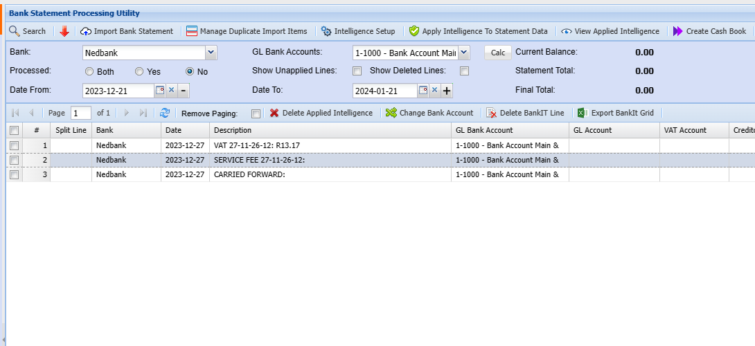| Create cash book | once the intelligence is applied, run the final step of creating a cash book |