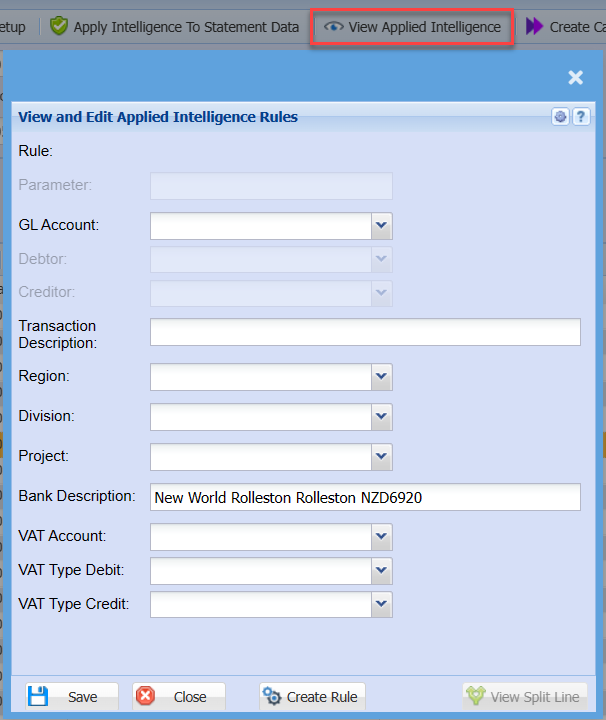 Either double click on a selected line or select a line and click on the View Applied Intelligence button. A screen will appear where a specific rule can be entered for this line i.e. GL Account, Debtor / Creditor (if applicable), Transaction, Region, Division and Project. This rule is not saved in the Rules Setup and is only ever applicable to this line.