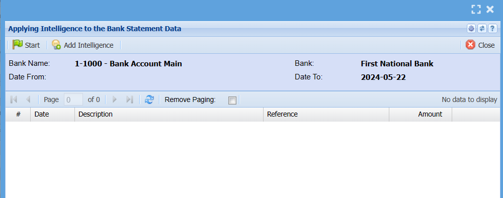 Click on Ok and the grid will be populated with all the records that were not processed by the automatic intelligence allocation. Either double click on a selected line or click on the line and click on the Add Intelligence button. The Bank Rules Maintenance screen will appear.