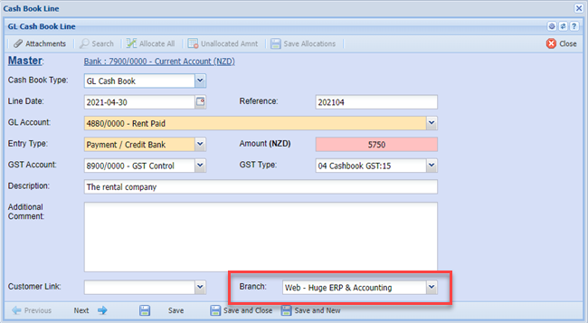 The cashbooks have been enhanced to include the branch per line.
