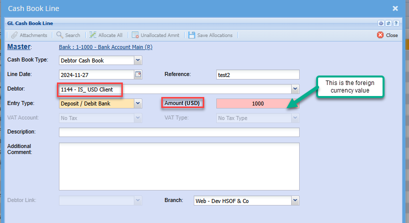 Cashbook Receipt - Foreign Debtor