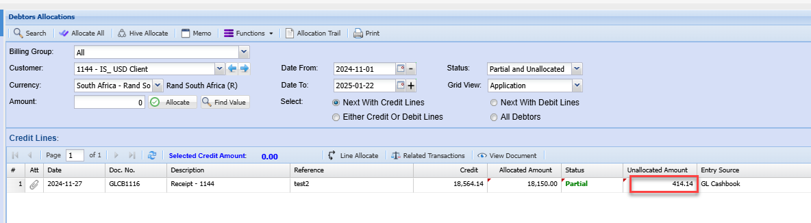 The Invoice and receipt values will typically match. and you can allocate as normal