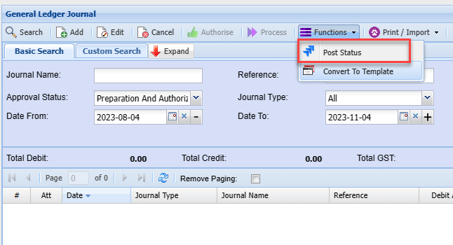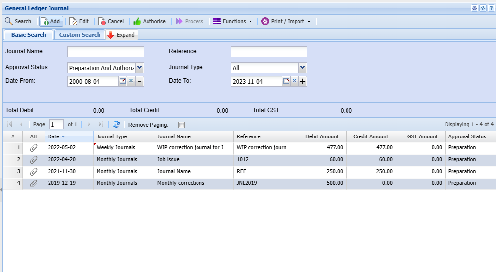 Once the journal has been posted to your books it will disappear off this search screen and will be transferred to the Journal history section.