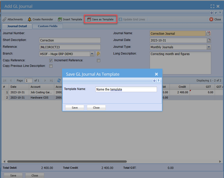 Journal templates are useful to save repetitive Journals each month, instead of capturing all the lines every month. Create the initial Journal and then click on the Template Tab and click on the “Save as Template”. Insert a Name for the template so you can recall it at anytime.