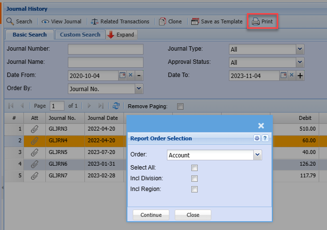 Click on the Print tab at the bottom of the page and highlight the Journal you want to print and click on the Print button. A criteria screen comes up to allow the general ledger journal to be sort by a. Account b. Account Code c. Date d. Description e. Reference