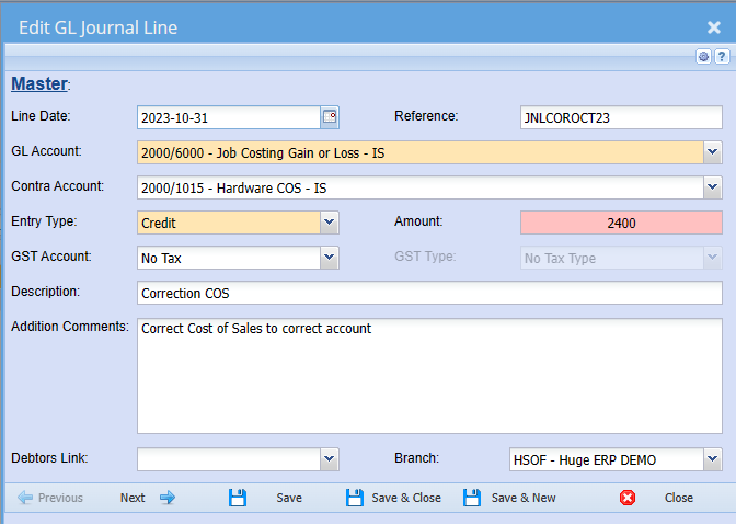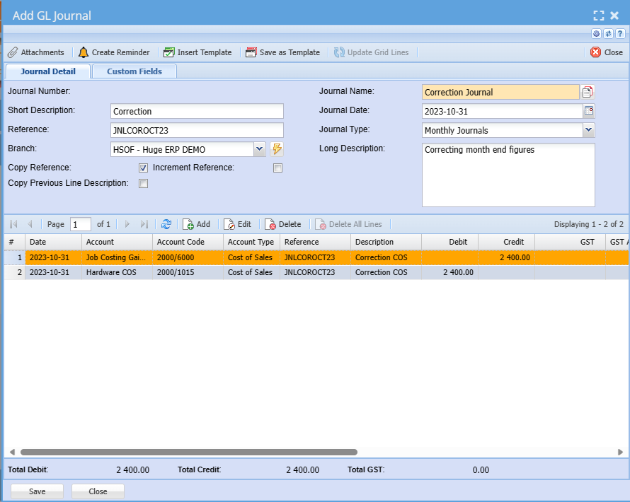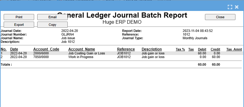 Huge ERP allows users to create Journals on the fly. Journal batches are kept in this section until they are processed to the books where they are moved to the Journal History section of the package.