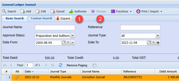 To process a journal click on the Process tab, a journal cannot be processed without being authorized first. Highlight the Journal and click on the Authorise Button and you will notice that the journal has changed statuses from Preparation to Authorised. The Process button now becomes active and you can process the journal.