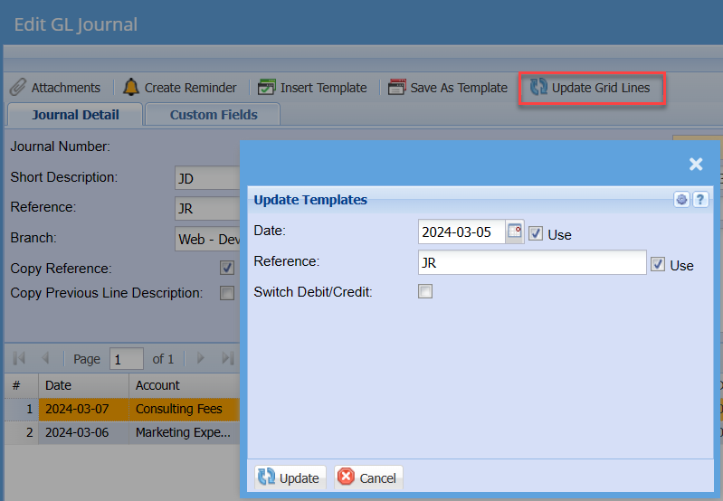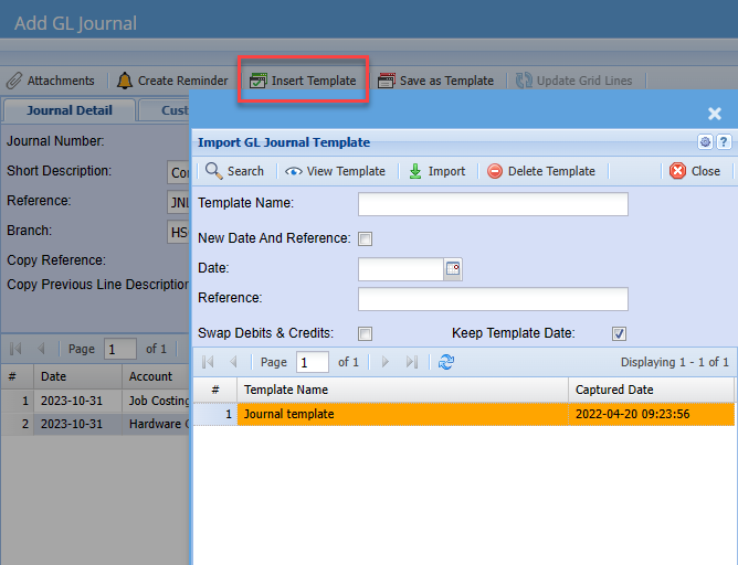 Inserting of a saved journal is simple, create a new Journal batch and save your Journal Headers. Click on the Template Tab and click on the Insert Template button. Select the Journal that you have saved and click on the Import button. Your saved journal template will now be put into the current Journal batch. The Dates of the lines will be inserted with today’s date.