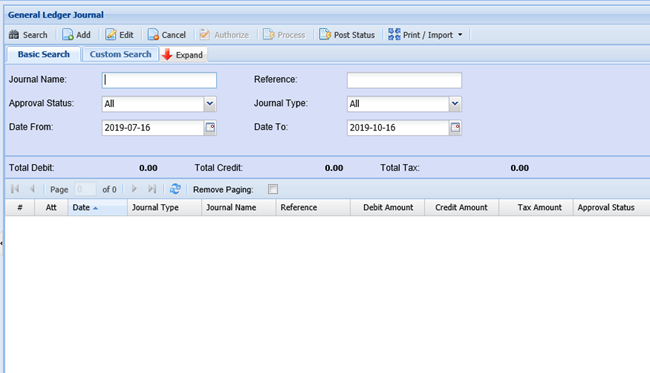 Huge ERP allows users to create Journals on the fly. Journal batches are kept in this section until they are processed to the books where they are moved to the Journal History section of the package.