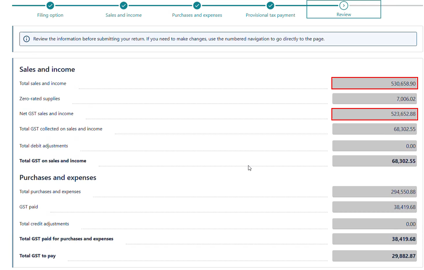 During the review, you may notice slight discrepancies between figures such as Total Sales and Income, and Net GST Sales and Income, compared to your GST Report.