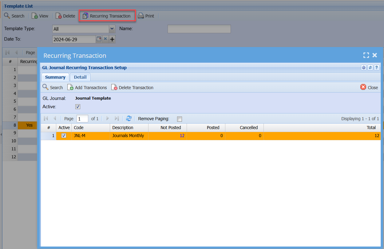General Ledger>Activity>Template List