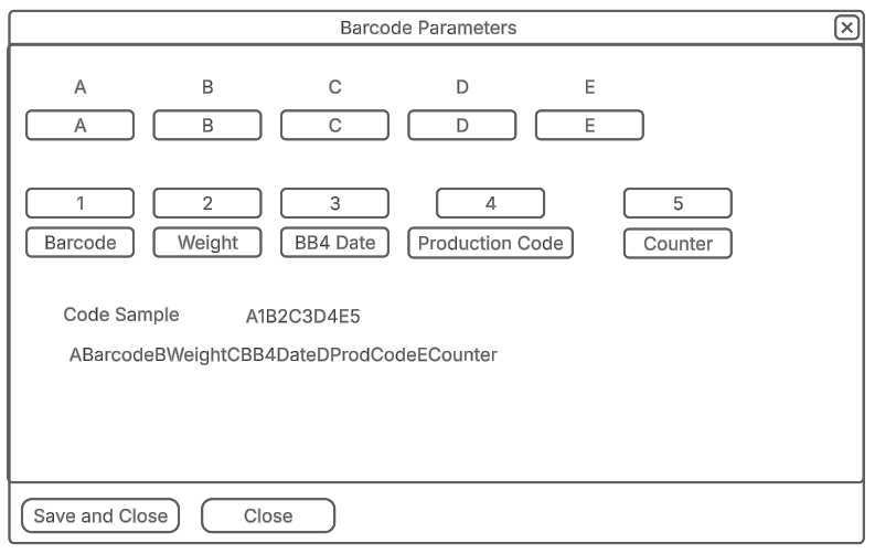 | A to E fields | Sets parameters to set for Barcode serial number |