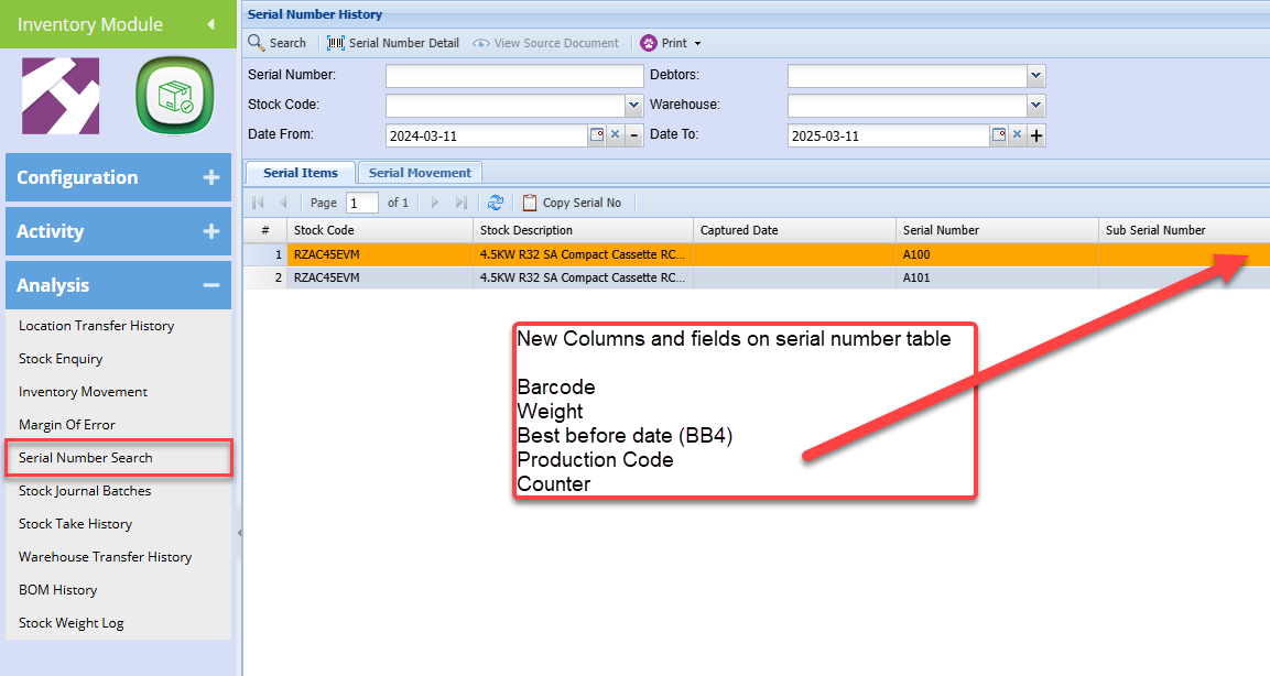 Serial numbers contain new columns and information from created barcodes (serial numbers)