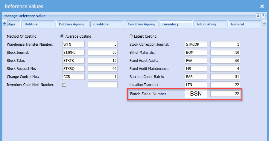 Reference value setup for Batch Serial number