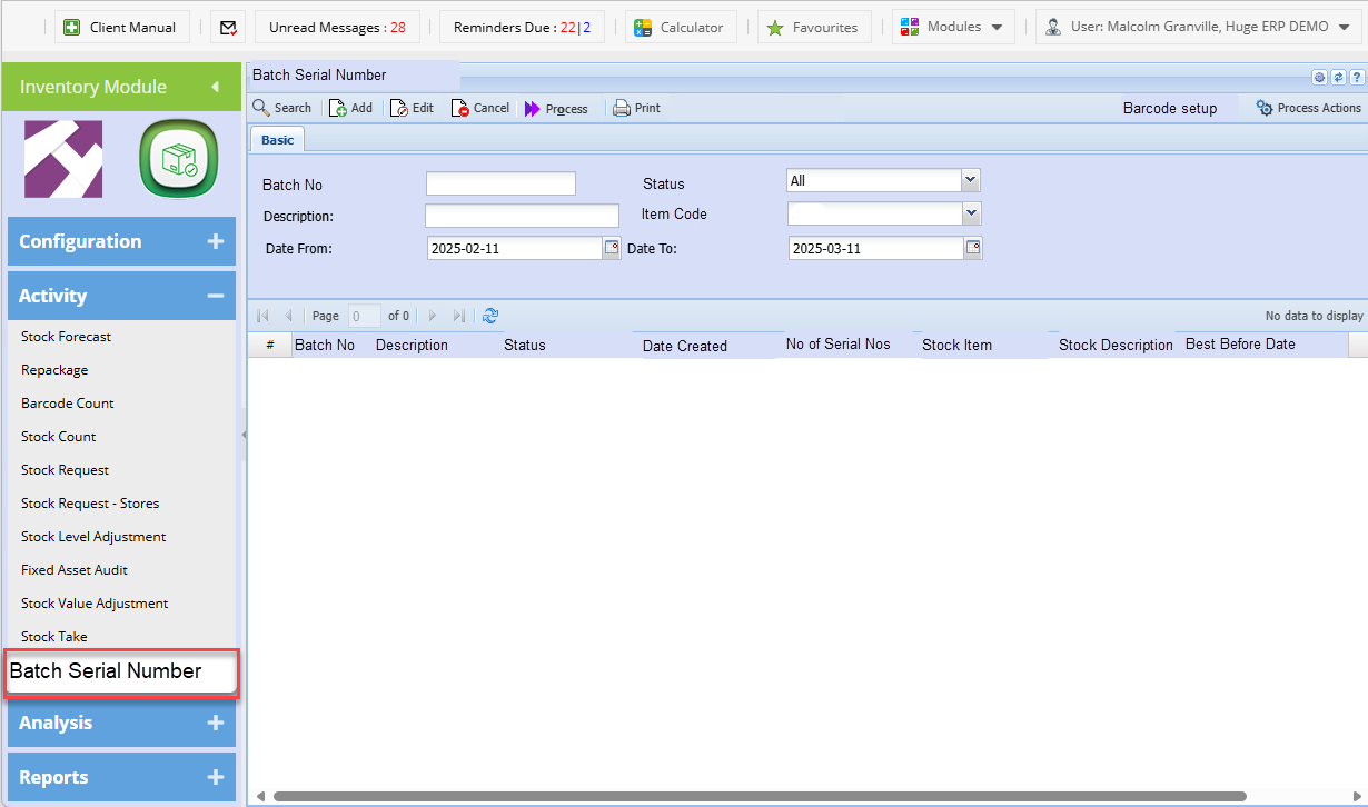 | Search | Search for Batch Serial number batches |
