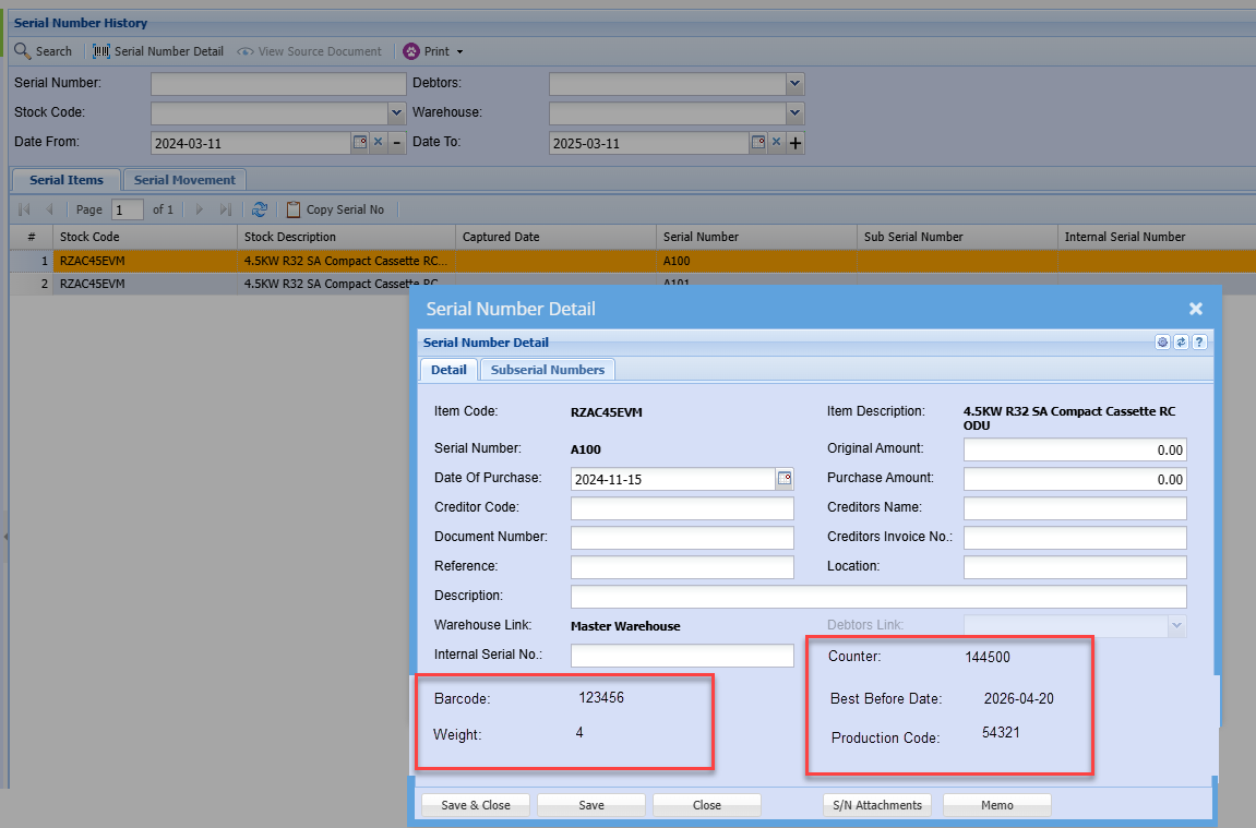 Information is shown on the serial number detail