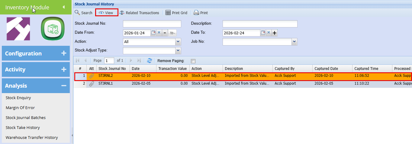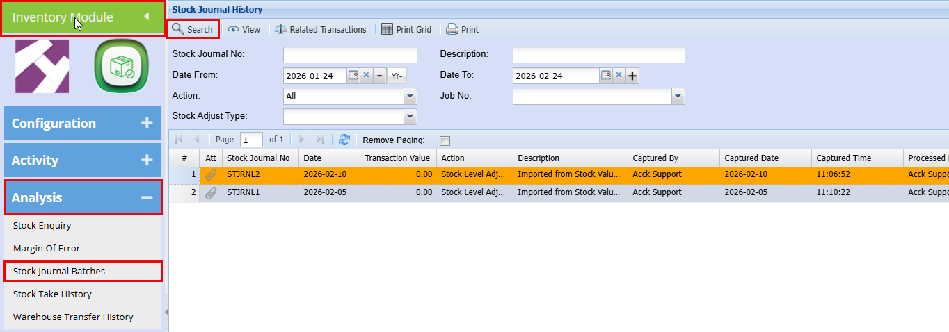 Inventory Module > Analysis > Stock Journal Batches