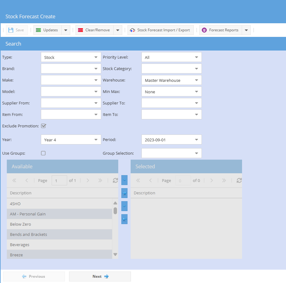 The screen below will appear allowing you to chose critiria for which stock items you want to run a forecast for