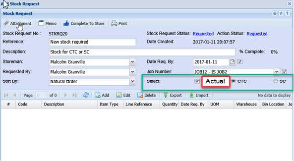 By default, the Actual to be Selected with a tick box and the CTC selection selected