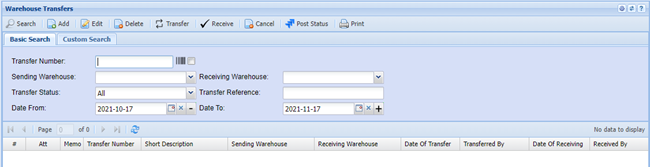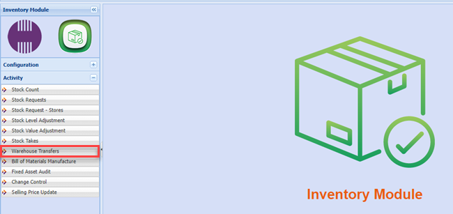 Inventory Module>Activity>Warehouse Transfers