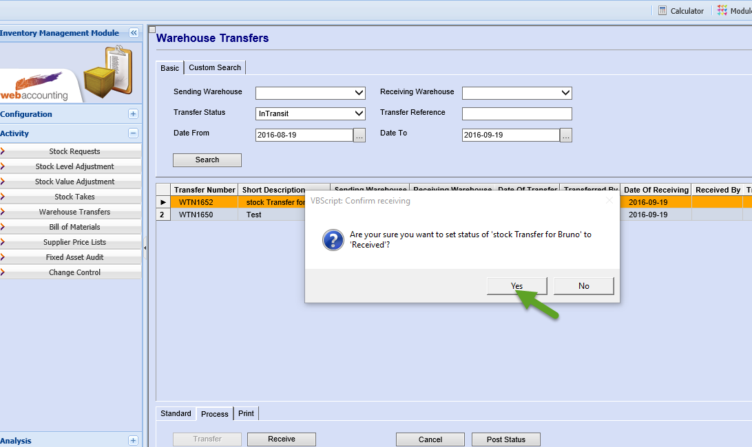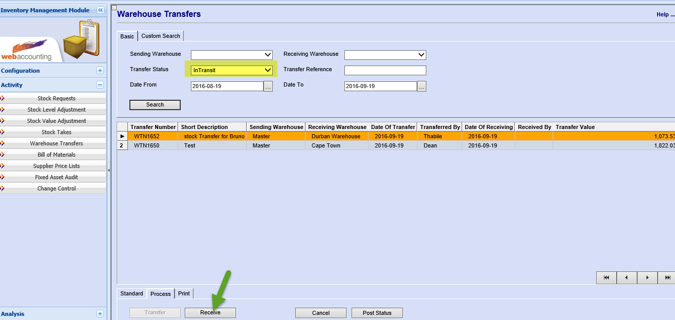 Inventory Module>Activity>Warehouse Transfers