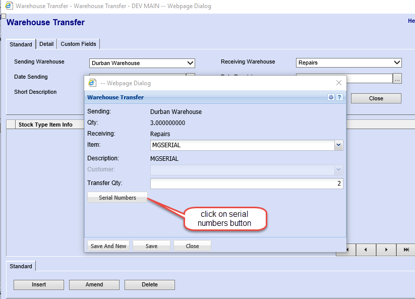 After When selecting the inventory The screen below will appear. Complete all the Search for the This is useful because you need to have items available on hand to effect the warehouse transfer. NB Adding items onto a transfer does not allocate it or prevent it from being sold to a client Click Process tab at the bottom of the window and Select Transfer button to start the process of transferring the stock. When you click transfer the items are allocated to the in transit status and removed from on hand inventory, this means that they are no longer available for selling. The Following window will pop up. From here on the stock can now be received into the warehouse. A printout report of the stock being transferred can be generated and emailed to the receiving clerk of the other warehouse. Once done proceed as shown on page 4- 7 Common errors that may prevent the transfer not to be processed is “the availability of stock from the sending warehouse.” And the warehouse not being linked to stock items being transferred. Receiving